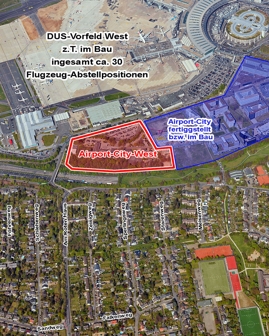 Als letzter Bauabschnitt des inzwischen international viel beachteten Business-Parks soll nun die Airport-City-West mit bis zu siebengeschossigen Büros, Geschäften und einem Hotel entstehen. Die Gebäude der Airport-City werden abgerissen, die Flughafenstraße neu angelegt.
